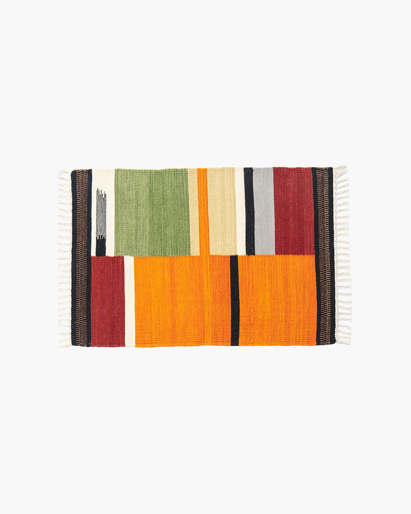 CHANTERELLE is a Kilim rug. Kilim is the name for a thin, flat, tapestry-woven, graphic style rug. It is made by weaving the horizontal yarn (weft) through vertical yarn (warp). The rug is woven so tightly that the warp is barely visible. This makes for a very durable rug, that can handle weight and movement.